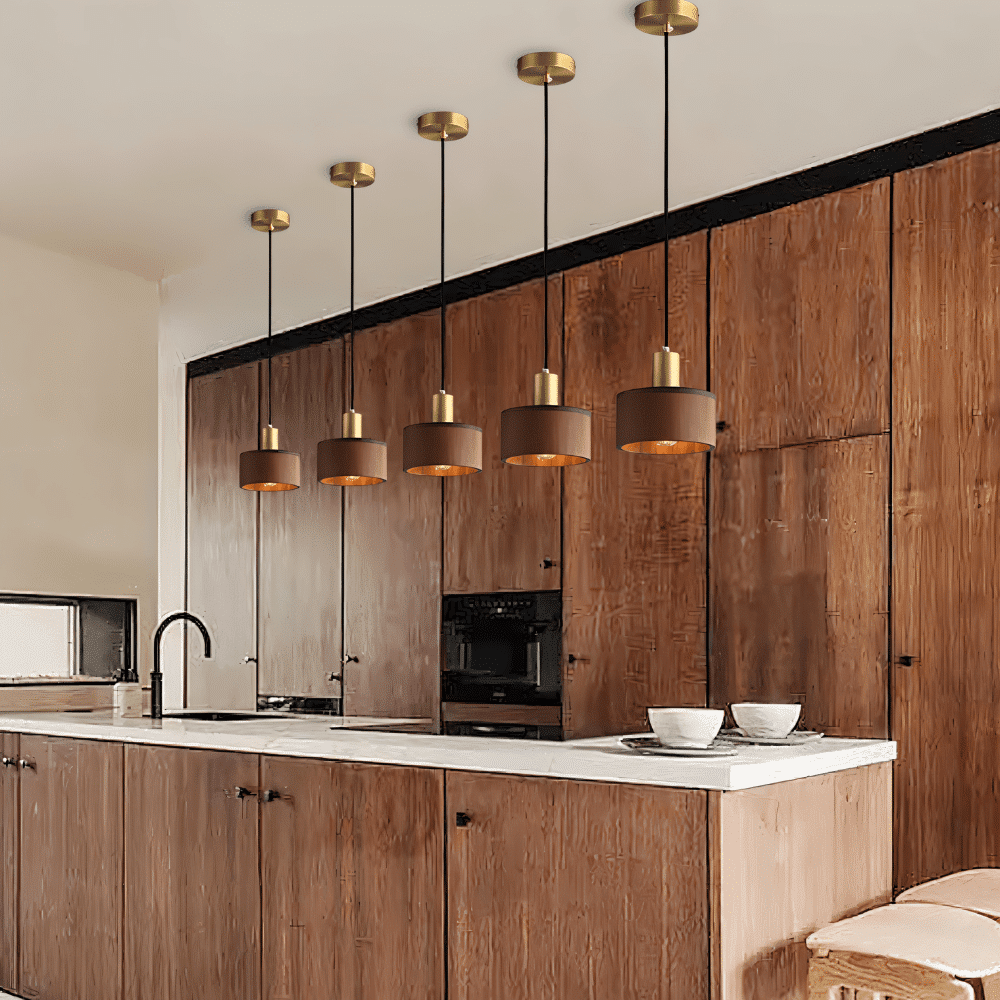 The Vesil Pendant Light features a striking fusion of copper and wood, crafted into a cylindrical lampshade with smooth edges and a brushed finish for a refined, contemporary look. Its dual-tone composition offers visual warmth, making it ideal as a light fixture above bedside tables, kitchen islands, or modern dining spaces. The downward-facing design focuses illumination, enhancing intimate settings with ambient glow. This light fixture elevates interiors with natural texture and modern brass accents.