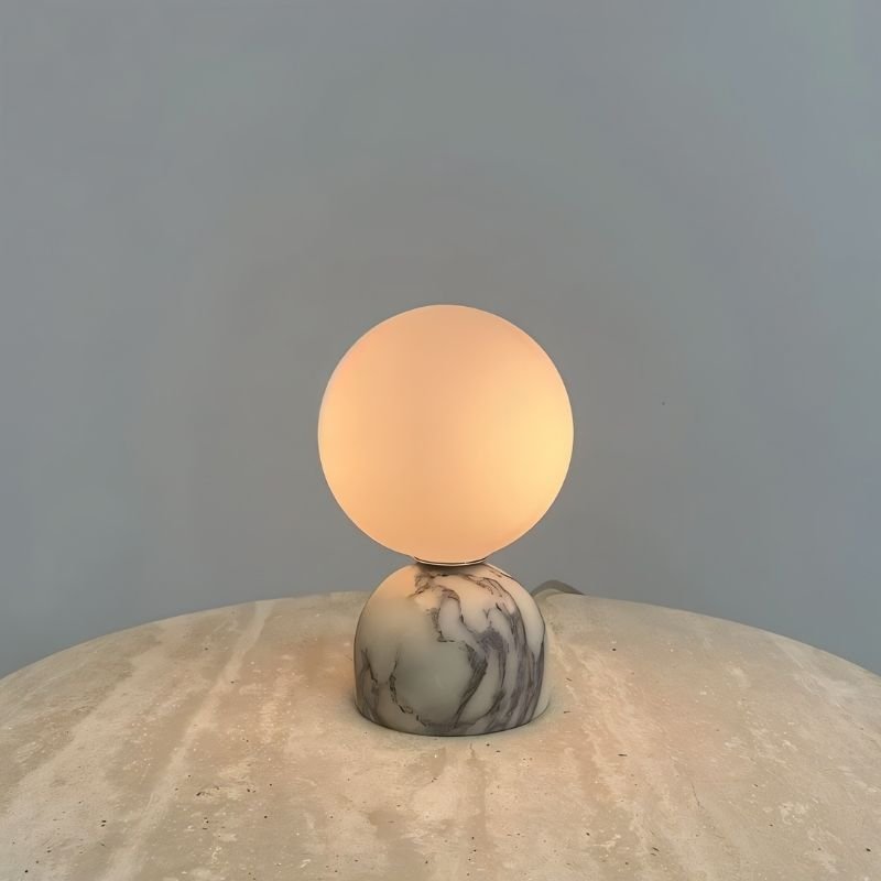 The Vexara Table Lamp is a sculptural light fixture with a spherical frosted glass shade balanced on a solid marble or stone base. Its compact, minimalist form enhances modern interiors, making it ideal for bedside tables, desks, or accent spaces. The natural variations in marble and stone create a distinct look for each piece. Designed for ambient lighting, it provides a soft, diffused glow. Perfect for contemporary, industrial, or organic-inspired settings.