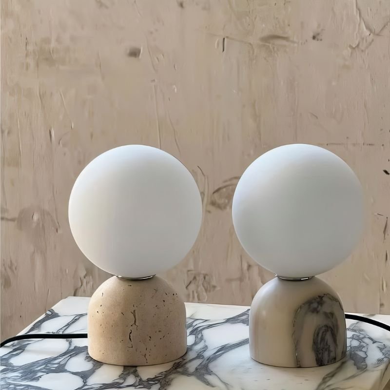 - Sculptural design blends natural stone or marble with a frosted glass globe.