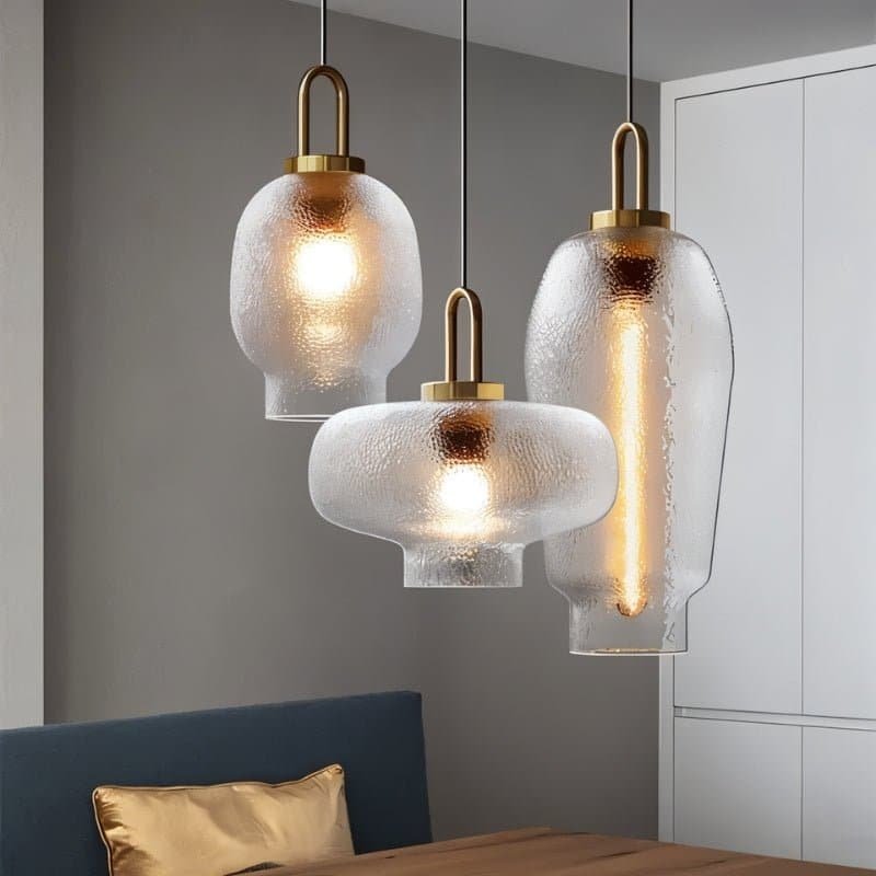 The Vishva Pendant Light is a modern light fixture crafted from high-quality glass and iron. Its textured glass shades create a beautiful play of light, adding elegance to any space. The minimalist metal details make it perfect for living rooms, dining areas, kitchens, or offices. This light fixture combines durability and style, enhancing the aesthetic of contemporary interiors.