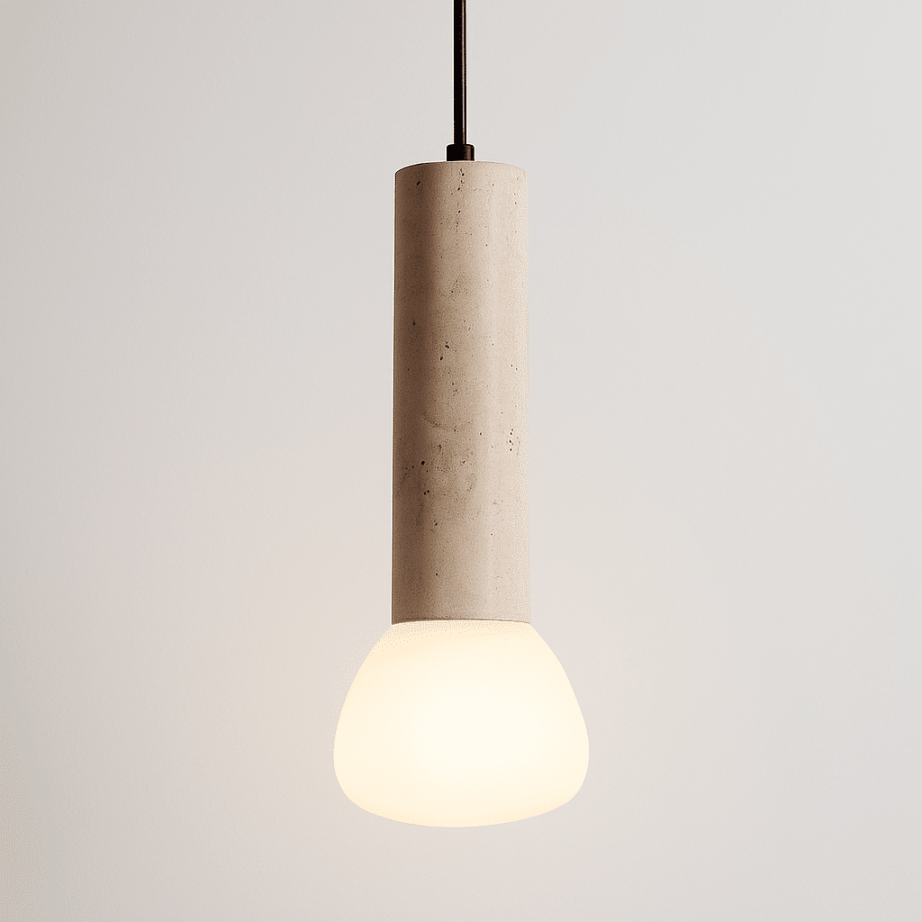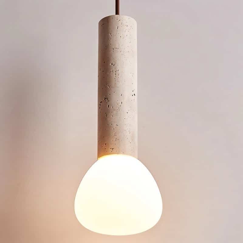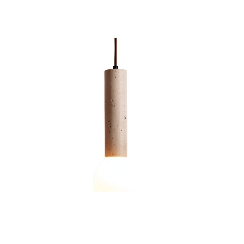 Voline pendant light features a sleek cylindrical travertine body with a frosted glass diffuser, creating soft, ambient illumination. Suspended by a minimalist metal fixture, this light fixture blends organic texture with modern design. Perfect for kitchen islands, dining areas, and bedside lighting, it enhances contemporary, rustic, and minimalist interiors.