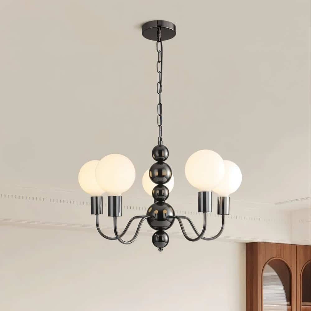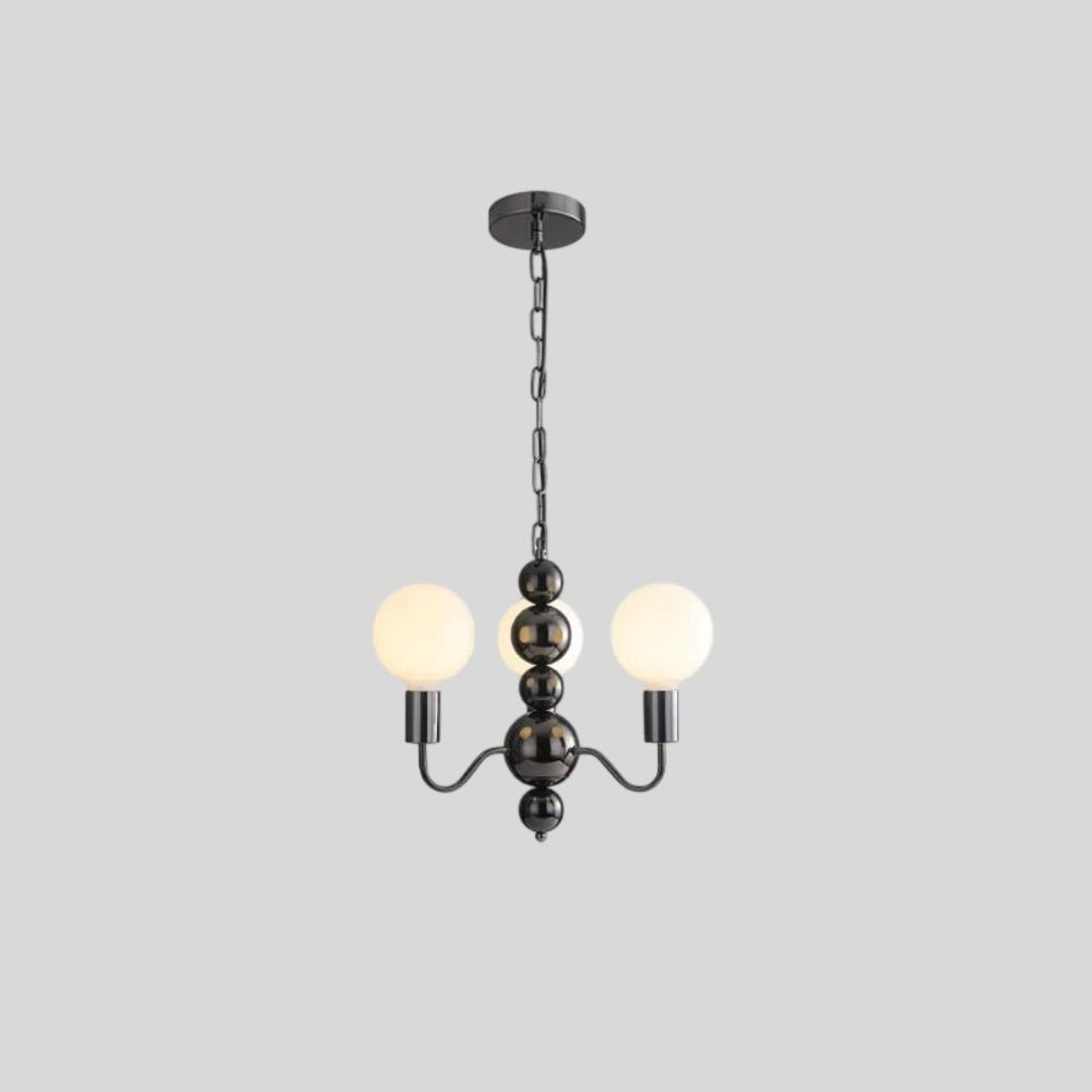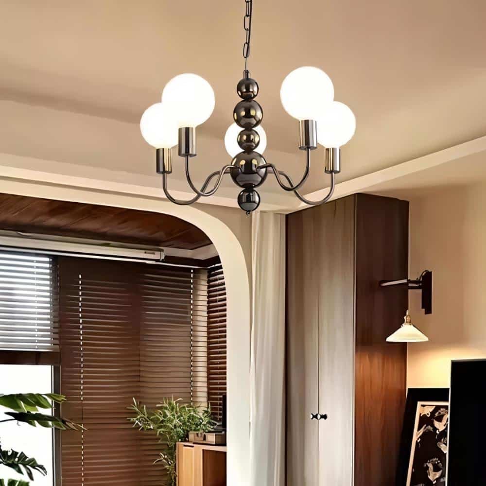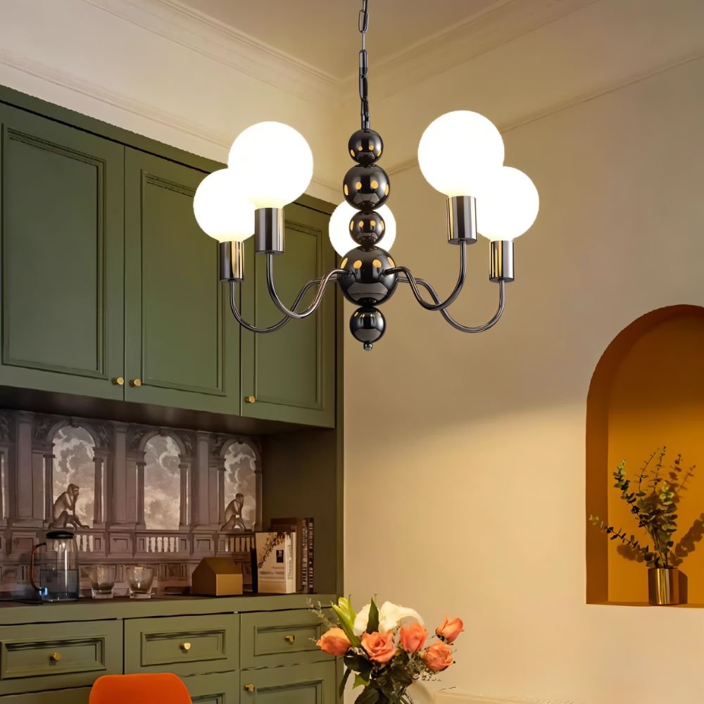 The Walfi chandelier is a bold light fixture featuring a sculptural iron frame with gracefully curved arms and frosted glass globes. The glossy iron spheres add a striking visual contrast, enhancing its elegant appeal. Designed to distribute soft, ambient lighting, it is perfect for living rooms, dining areas, and grand entryways. Its timeless silhouette blends classic and modern elements, making it an ideal statement piece for sophisticated interiors.