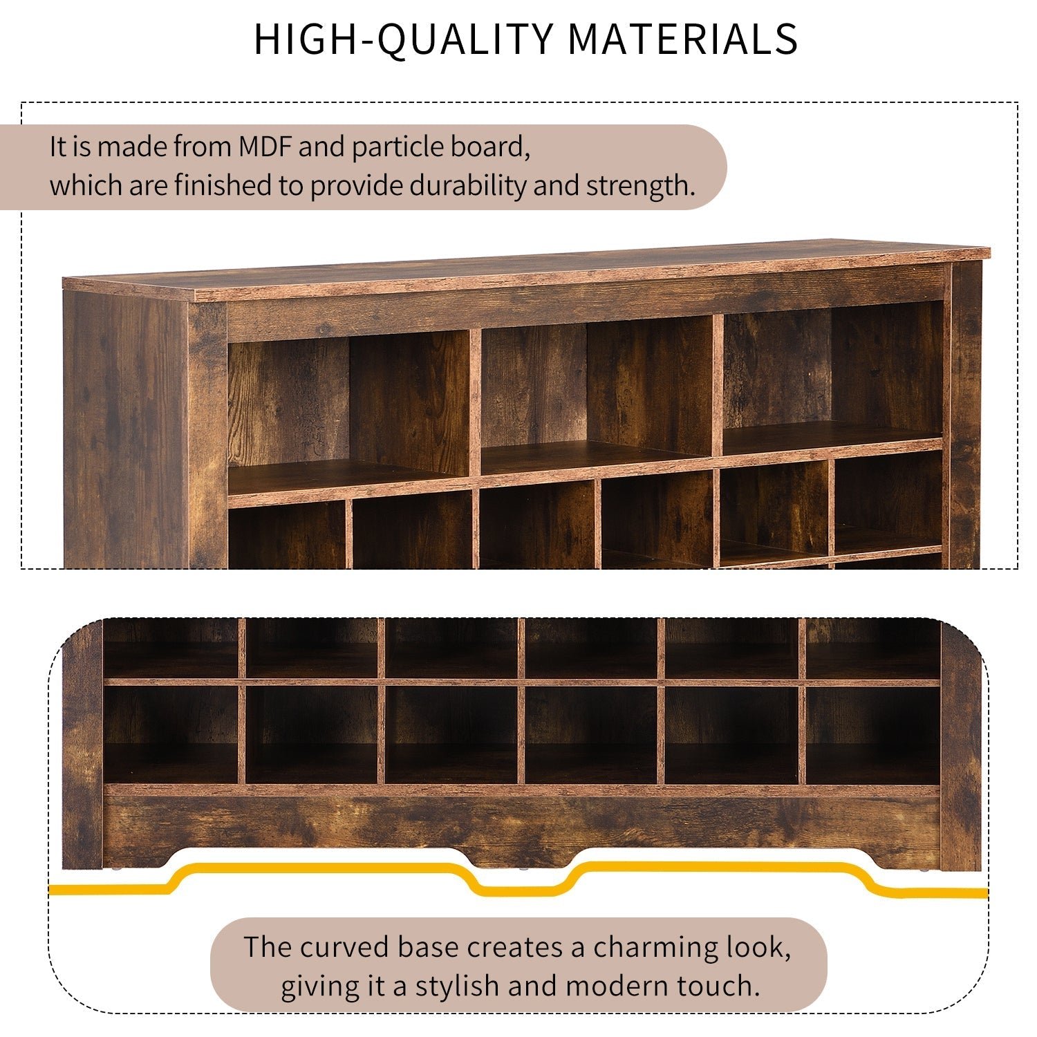 The square shoe cabinet boasts a contemporary and minimalist design that will enhance the look of any room. Its smooth and streamlined shape complements a wide range of interior decors. The curved base creates a charming look, giving it a stylish and modern touch.