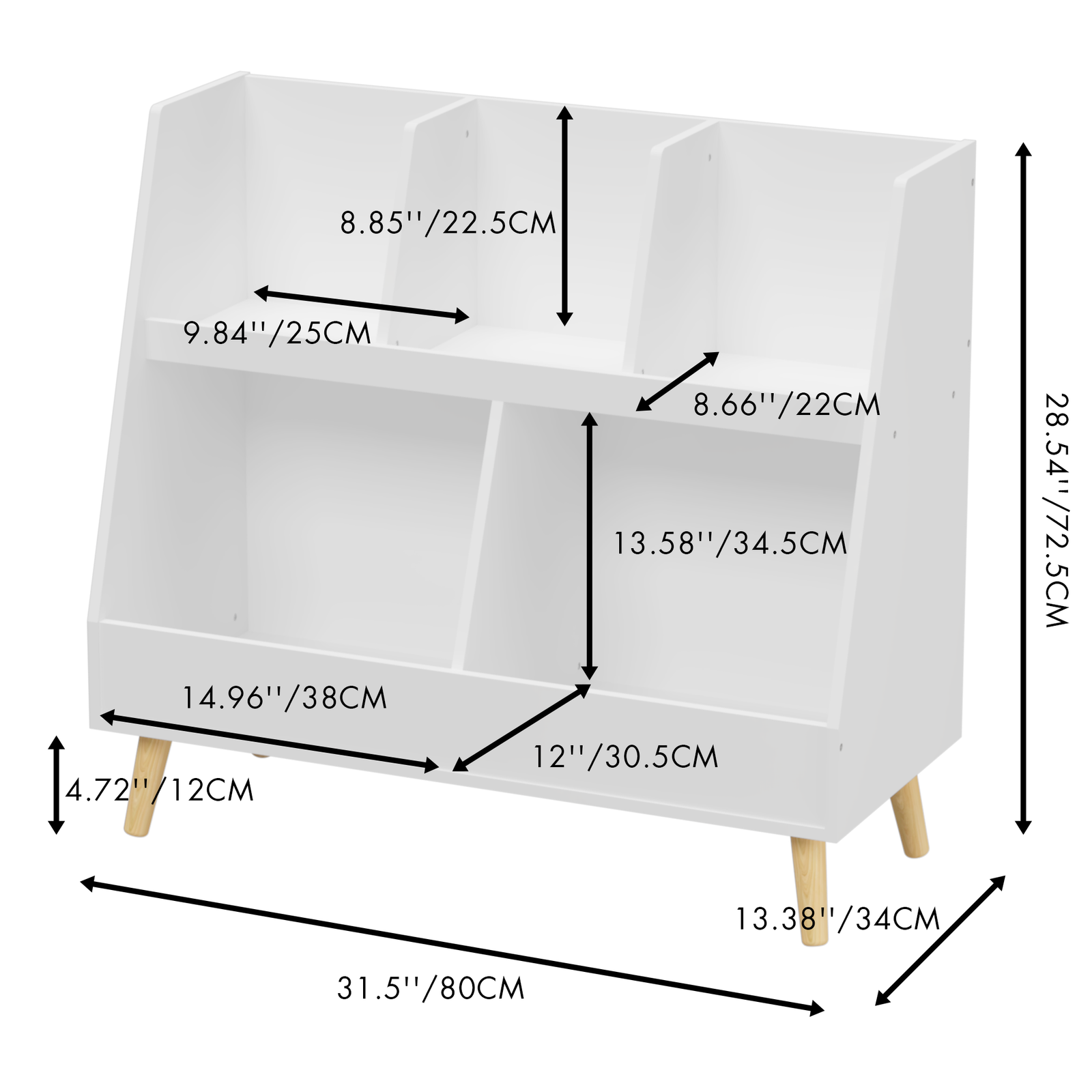 With five open cubbies, little hands can easily reach their favorite storybooks or toys, encouraging independence and sparking endless hours of imaginative play. Two large bins offer a special place for dolls, stuffed animals, puzzles, and cherished treasures, making tidying up a breeze for both you and your child.