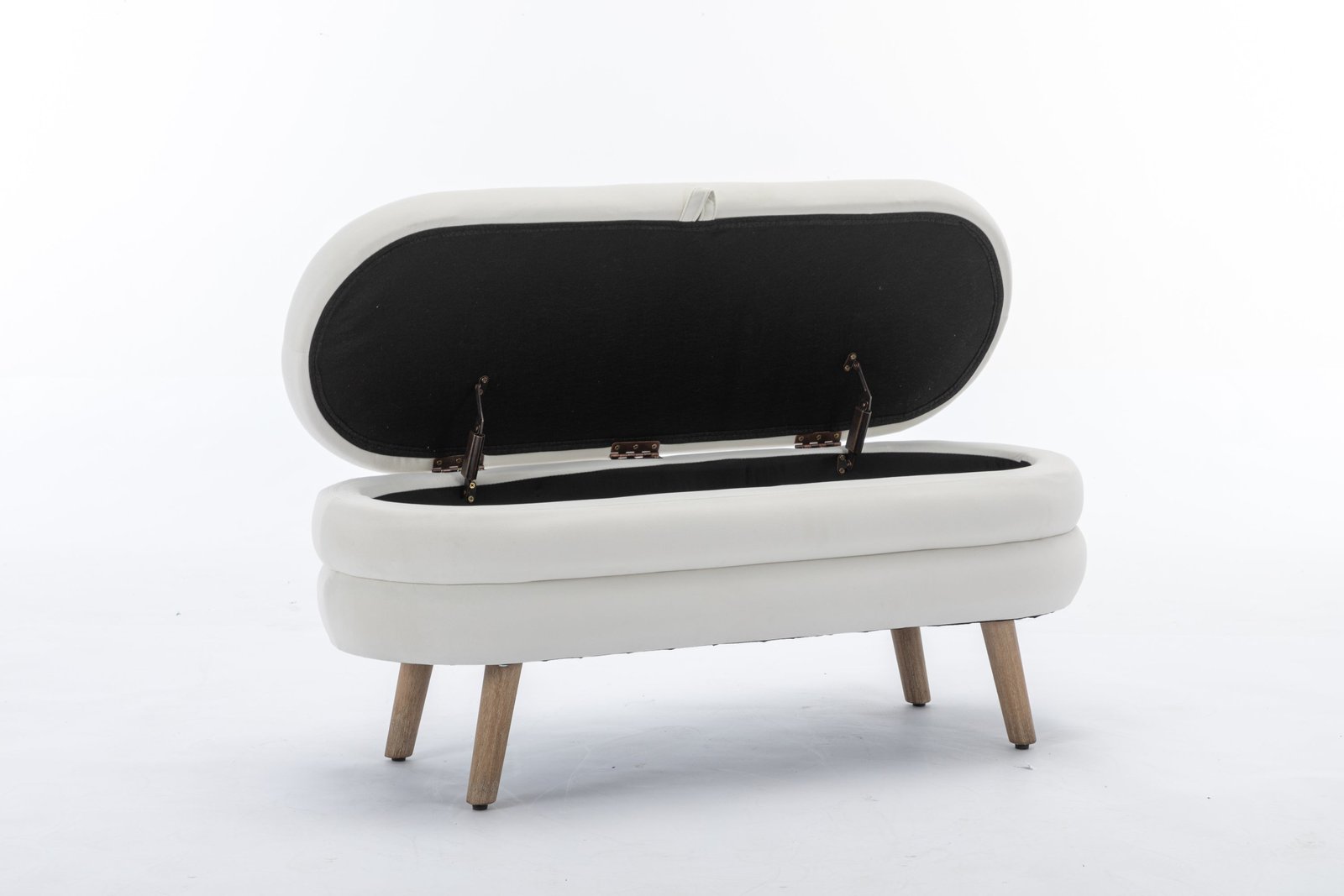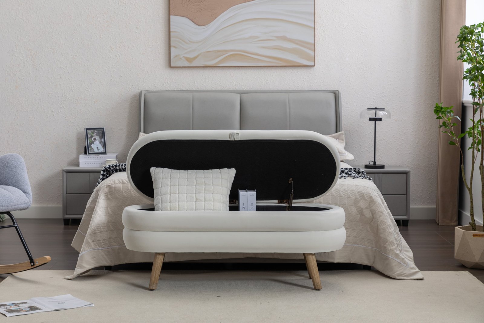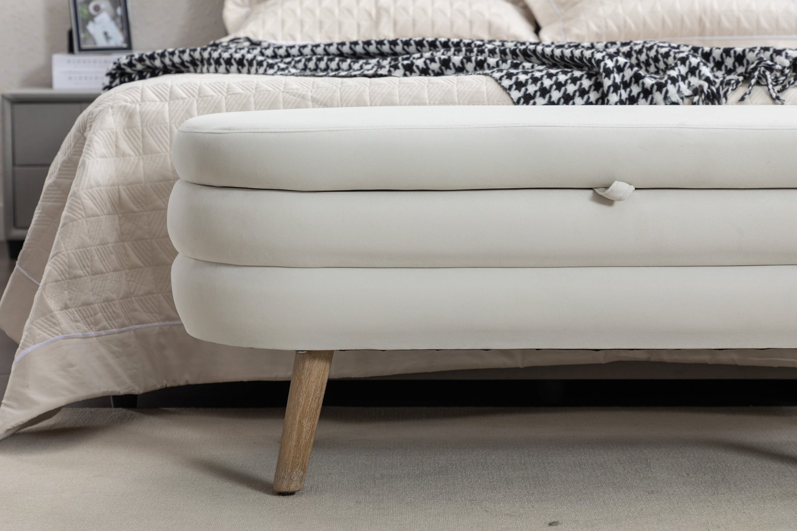 White Velvet Storage Bench, a chic addition to any bedroom or living room. Crafted from luxurious velvet fabric, this modern bench offers both comfort and functionality with its tufted design and internal storage.