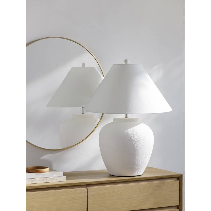 Introducing the Wallasey Accent Table Lamp, a striking addition to any home or office space. With its industrial rustic style, this lamp is designed to impress and illuminate. The body of the lamp is made of ceramic, lending it an earthy touch that contrasts beautifully with the metallic finial at the top. A linen shade gently diffuses light, creating a warm and inviting atmosphere in your room. Standing 29 inches tall, this accent lamp makes a statement without overpowering your decor. Maintaining its lustrous appearance is simple ? just wipe clean with a dry cloth and avoid harsh cleaners to protect its finish. Make every corner of your space shine with the Wallasey Accent Table Lamp.
