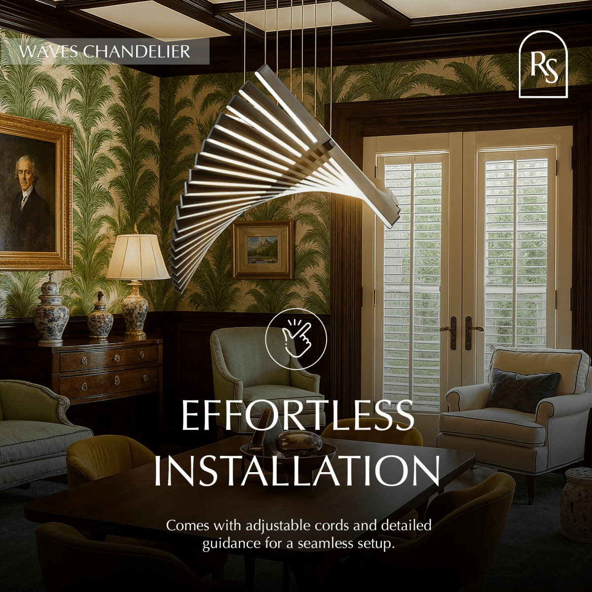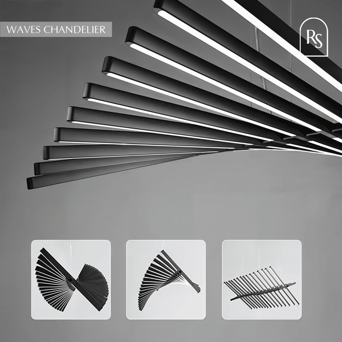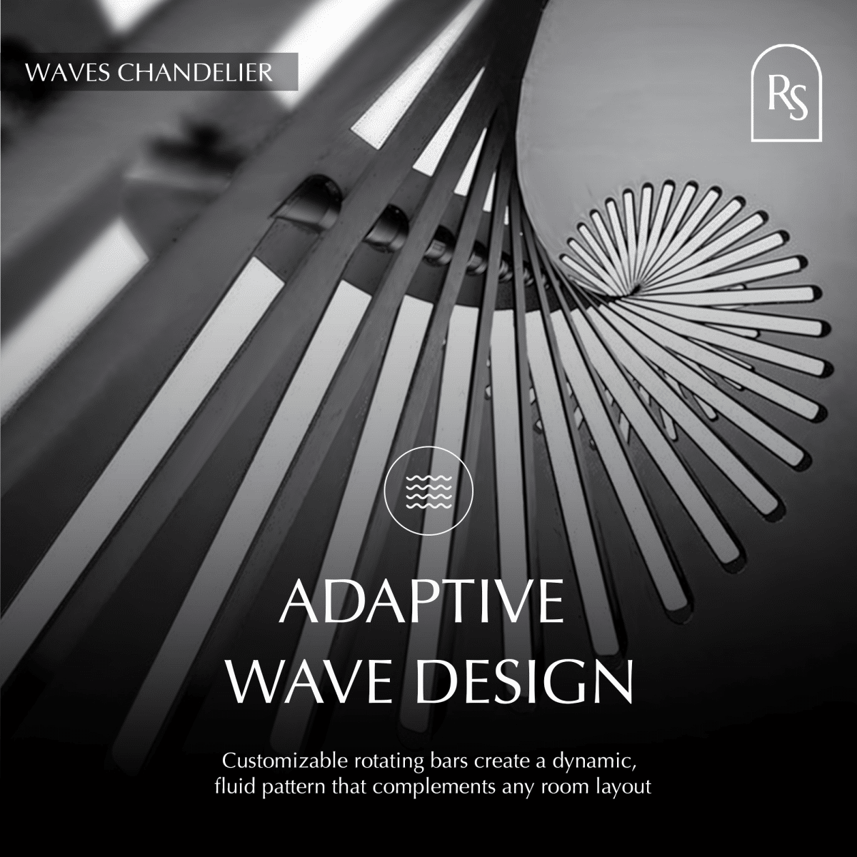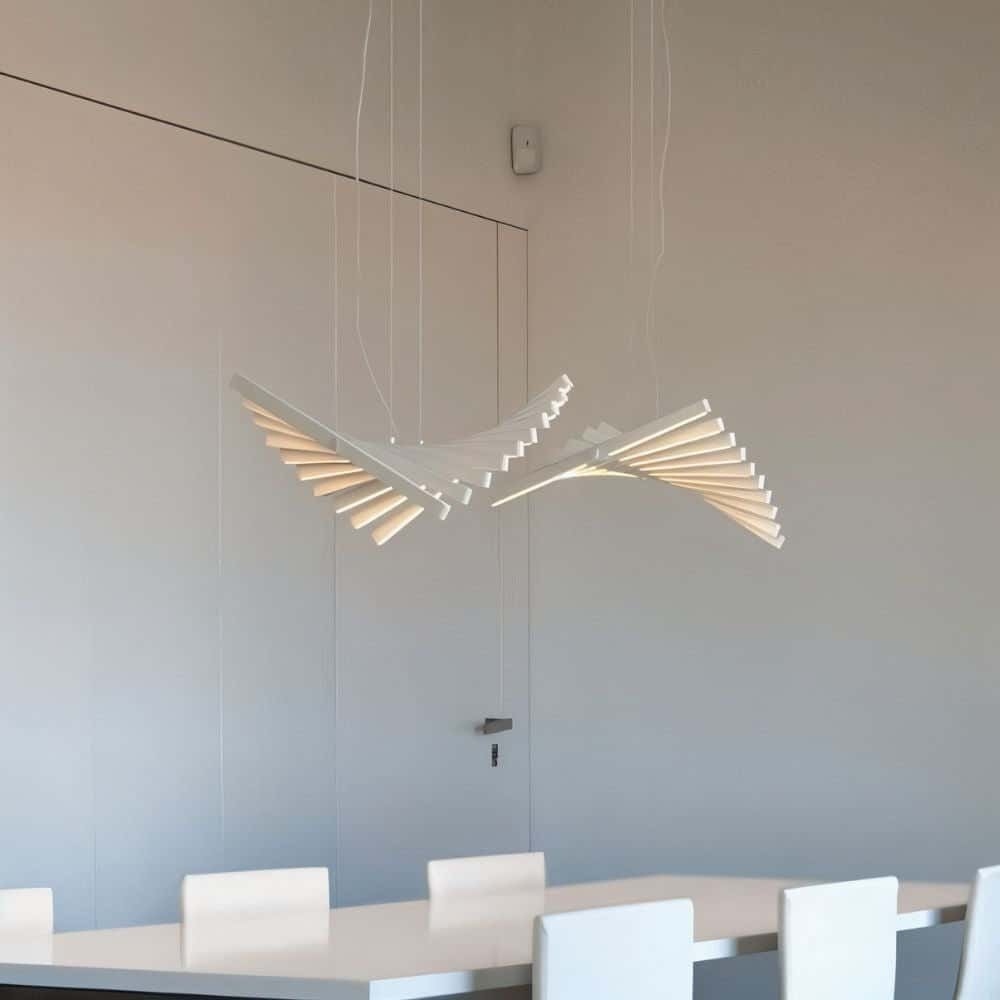 Waves Chandelier is the centerpiece that impresses guests with its signature pattern. The center axis allows for the rotation of each bar making every fixture flow with your room’s design. Design it your way whether it be for the stairway or kitchen island. Ideal for offices, living areas, kitchens, stairways, and dining areas.