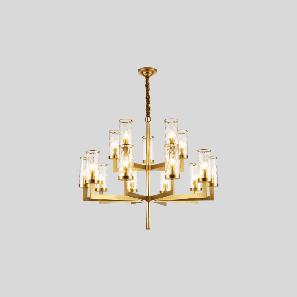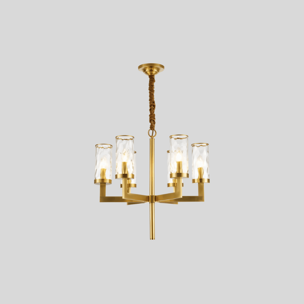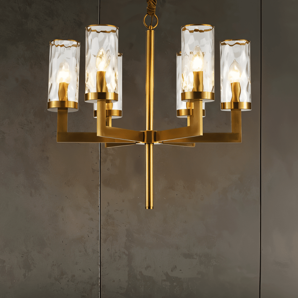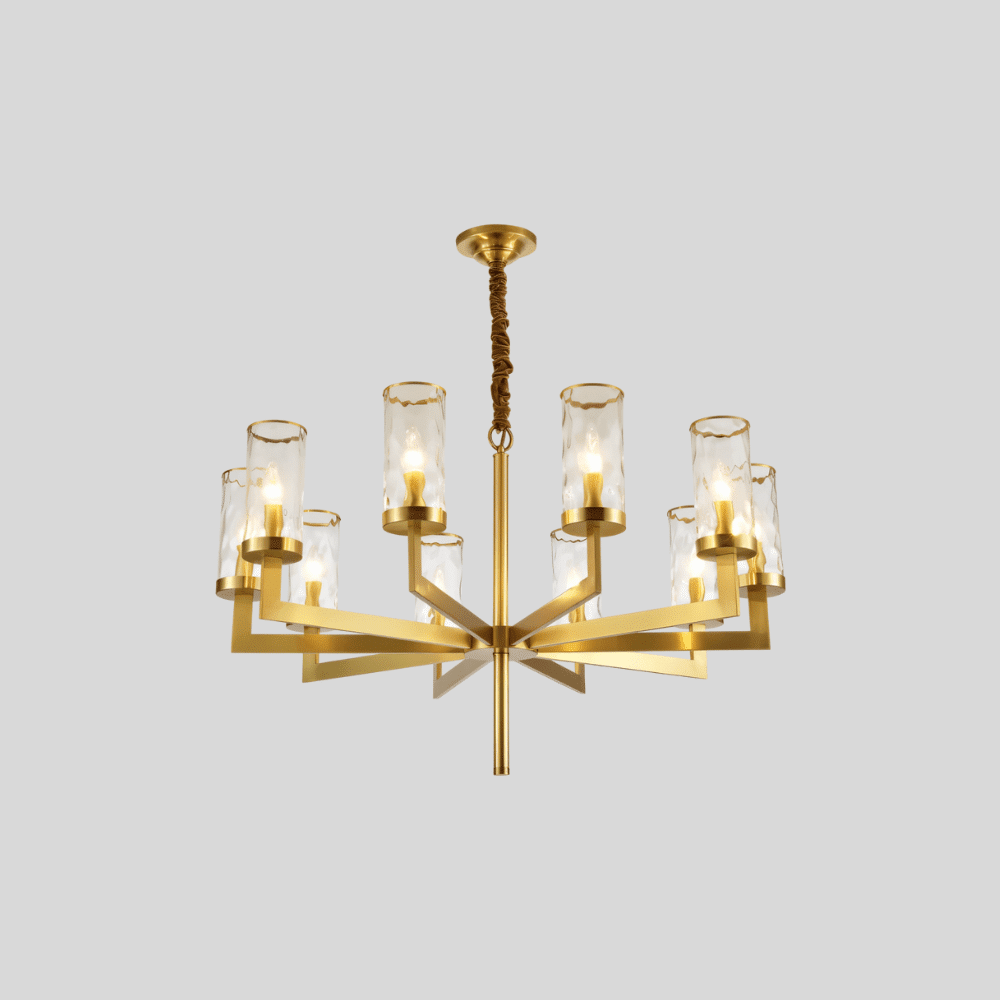 Wynlo Chandelier is a sculptural light fixture crafted from premium copper and crowned with wavy-edged glass lampshades. Its bold geometric arms radiate from a central stem, delivering modern symmetry with a luxe gold finish. The flame-style bulbs enhance ambiance through textured glass diffusers. Ideal for living rooms, dining spaces, or foyers seeking a dramatic lighting centerpiece. Designed to accommodate both intimate and spacious interiors with versatile scale options.