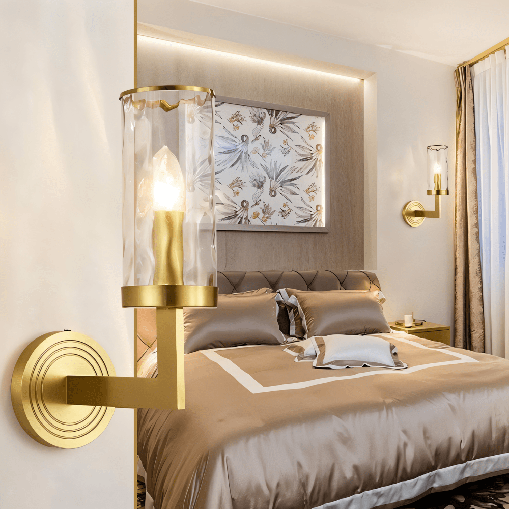 The Wynlo Wall Lamp is a refined light fixture crafted from premium copper and paired with a textured glass lampshade that diffuses light with a warm, ambient glow. Its cylindrical design and ripple-edged glass deliver a sophisticated aesthetic, while the concentric-circle backplate adds modern geometric appeal. The upward-facing bulb within the clear shade enhances vertical lighting dispersion. Ideal for installation in bedrooms, hallways, or upscale living spaces, this wall-mounted light fixture complements both modern and classic interiors. Its minimal projection and elegant finish make it a stylish yet functional décor accent.