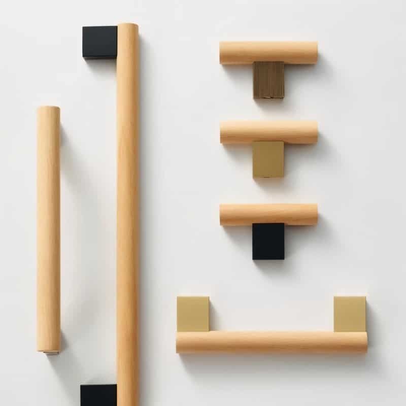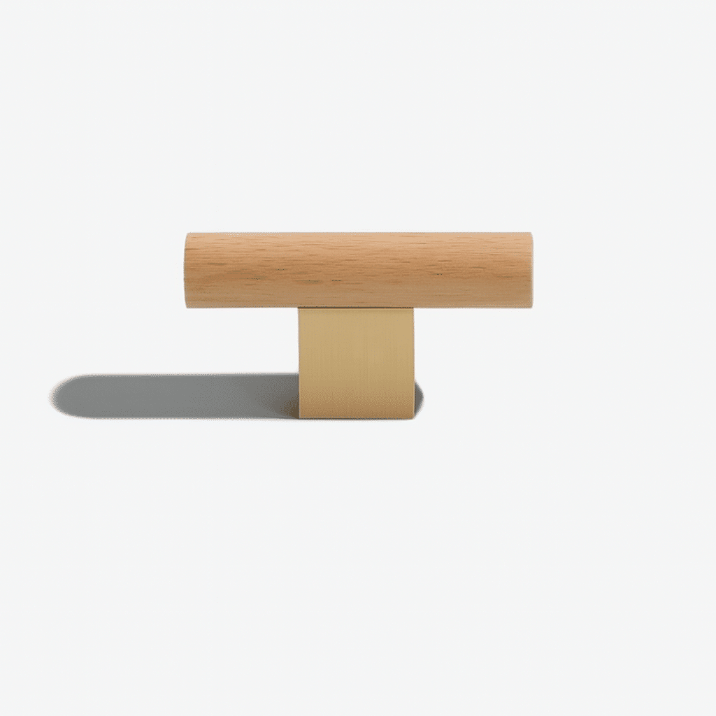 The Yeet handle showcases a sleek, modern design blending natural wood with bold brass accents. Its minimalist style pairs geometric shapes with a natural finish, making it an ideal choice for contemporary cabinets, drawers, or wardrobe doors. Designed for durability and elegance, it complements clean-lined interiors while offering a functional yet aesthetic appeal.