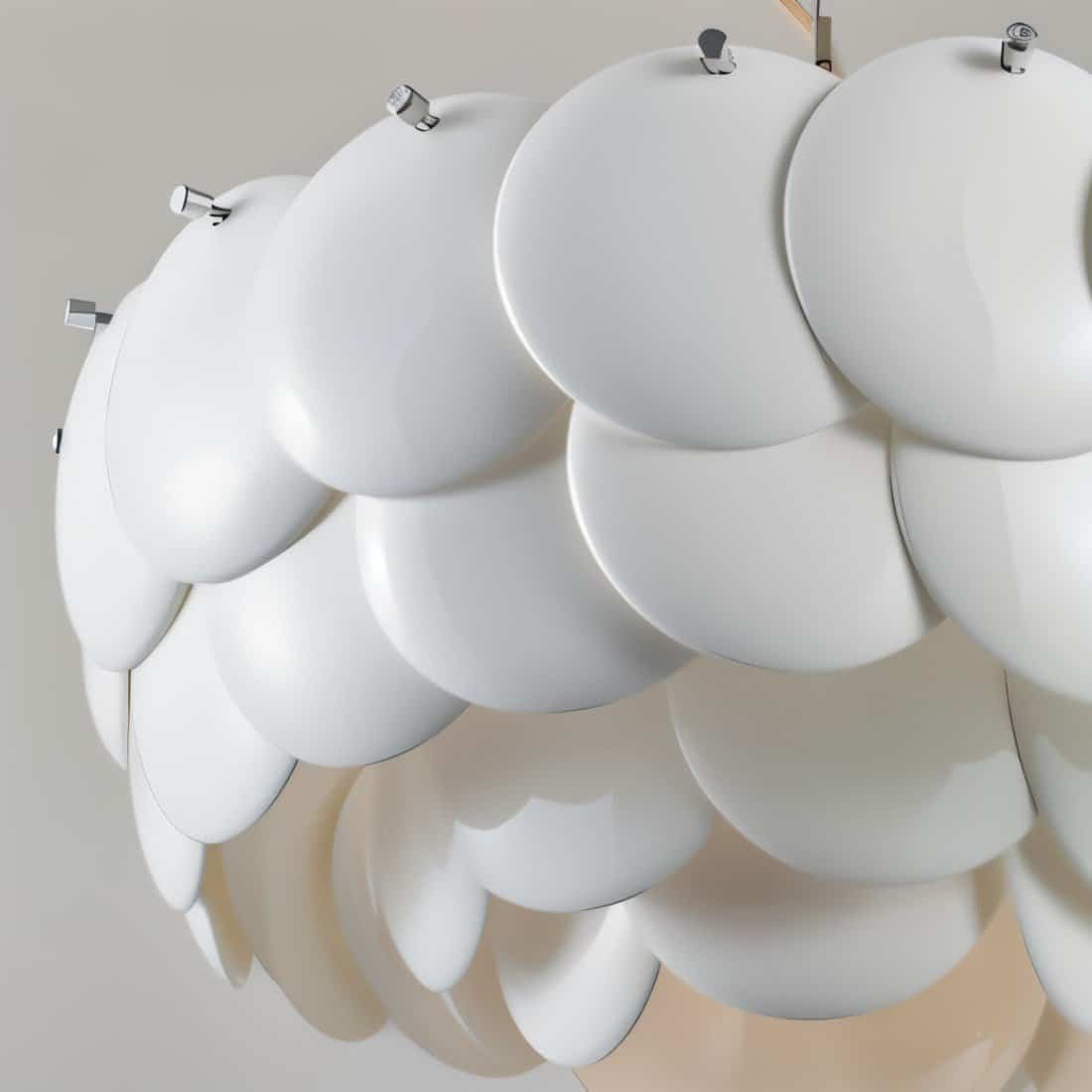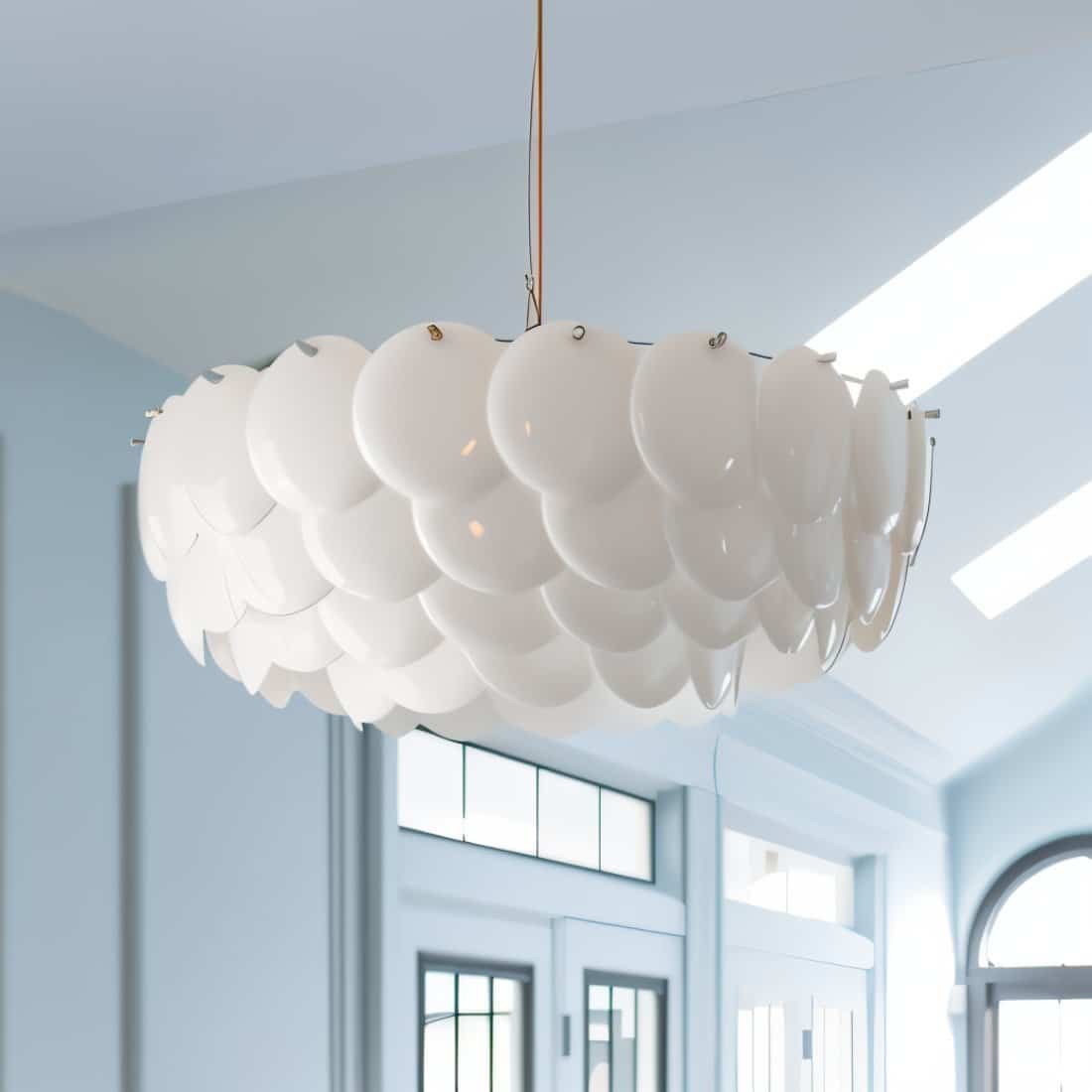 The Zahir Chandelier features a unique and sculptural design with cascading layers of overlapping ceramic discs. Crafted from iron and ceramic, this modern light fixture emits a warm and diffused glow. The Zahir Chandelier is ideal for modern dining rooms, living rooms, or entryways, creating a striking focal point and adding a touch of artistic flair to any space.