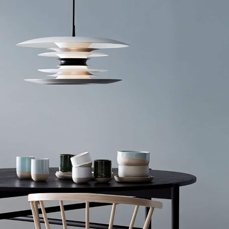 The Zentri Pendant Light is a modern aluminum and acrylic light fixture with a layered, disc-like design that diffuses light evenly. Its sculptural form creates a striking visual effect, making it ideal for dining areas, kitchens, or contemporary living spaces. The suspended structure balances function and aesthetics, offering ambient illumination with minimal glare. Available in four color combinations, it adapts seamlessly to different interiors.