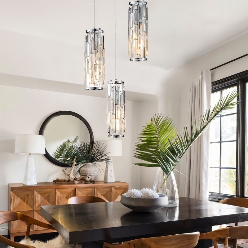 The Zevar Pendant Light combines an iron frame with crystal elements, creating a structured yet luminous design. Its geometric crystal arrangement refracts light, adding depth and sophistication. Available in 1, 3, 4, and 5-light configurations and three color options, it suits kitchens, dining areas, and entryways. The suspended design offers a balanced blend of industrial strength and modern elegance. Ideal for both residential and commercial spaces, this light fixture enhances ambient and task lighting.