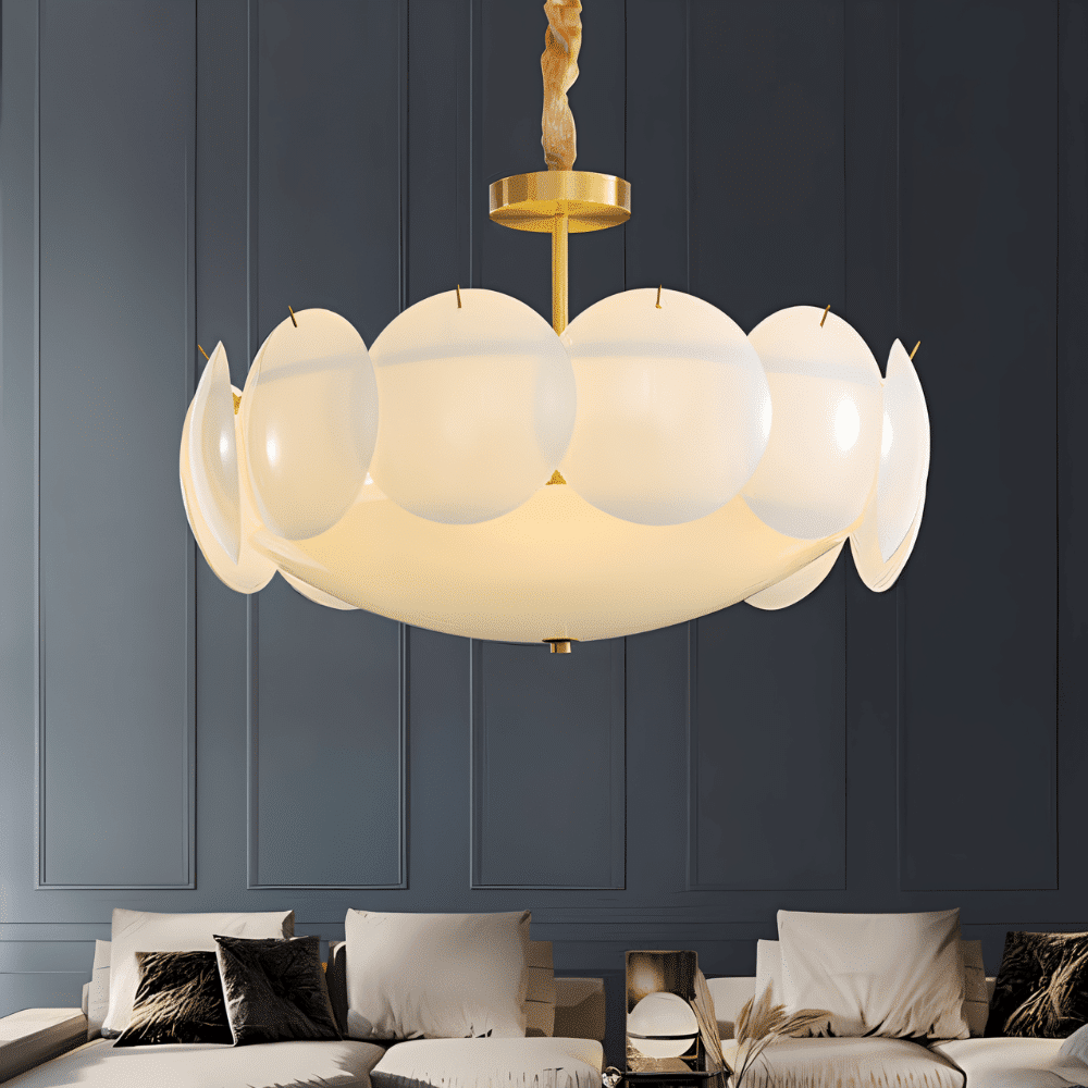 The Zuvin Chandelier is a sculptural light fixture crafted from copper with a frosted glass lampshade arranged in a scalloped circular design. Its layered petal-like glass panels diffuse light evenly, casting a warm ambient glow ideal for modern living rooms, bedrooms, or boutique dining spaces. The elegant brass ceiling mount and central rod add a contemporary metallic accent. This ceiling-mounted light fixture balances organic form with luxury detailing.