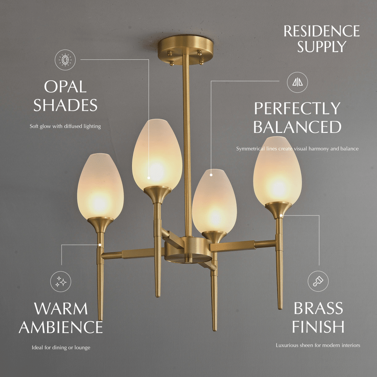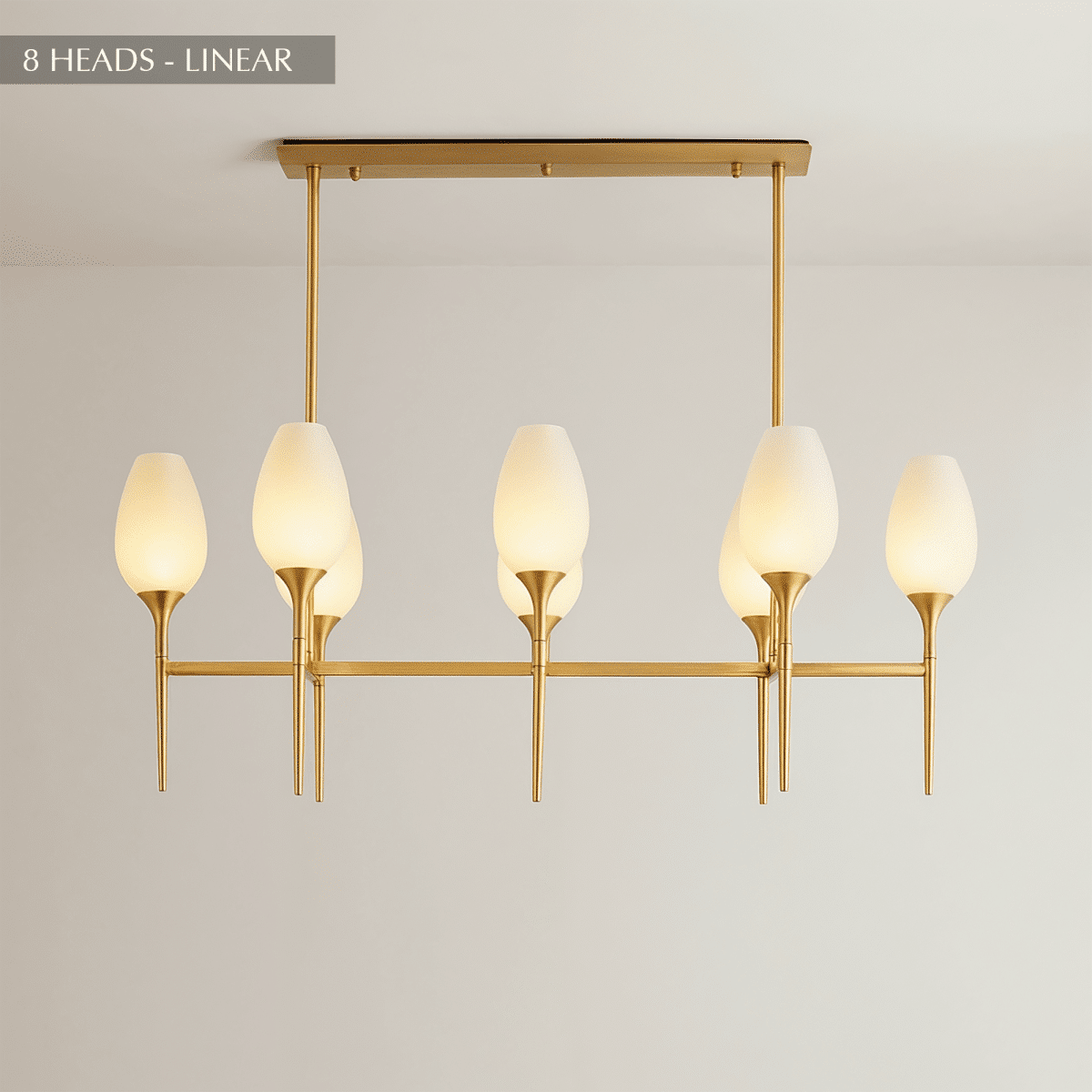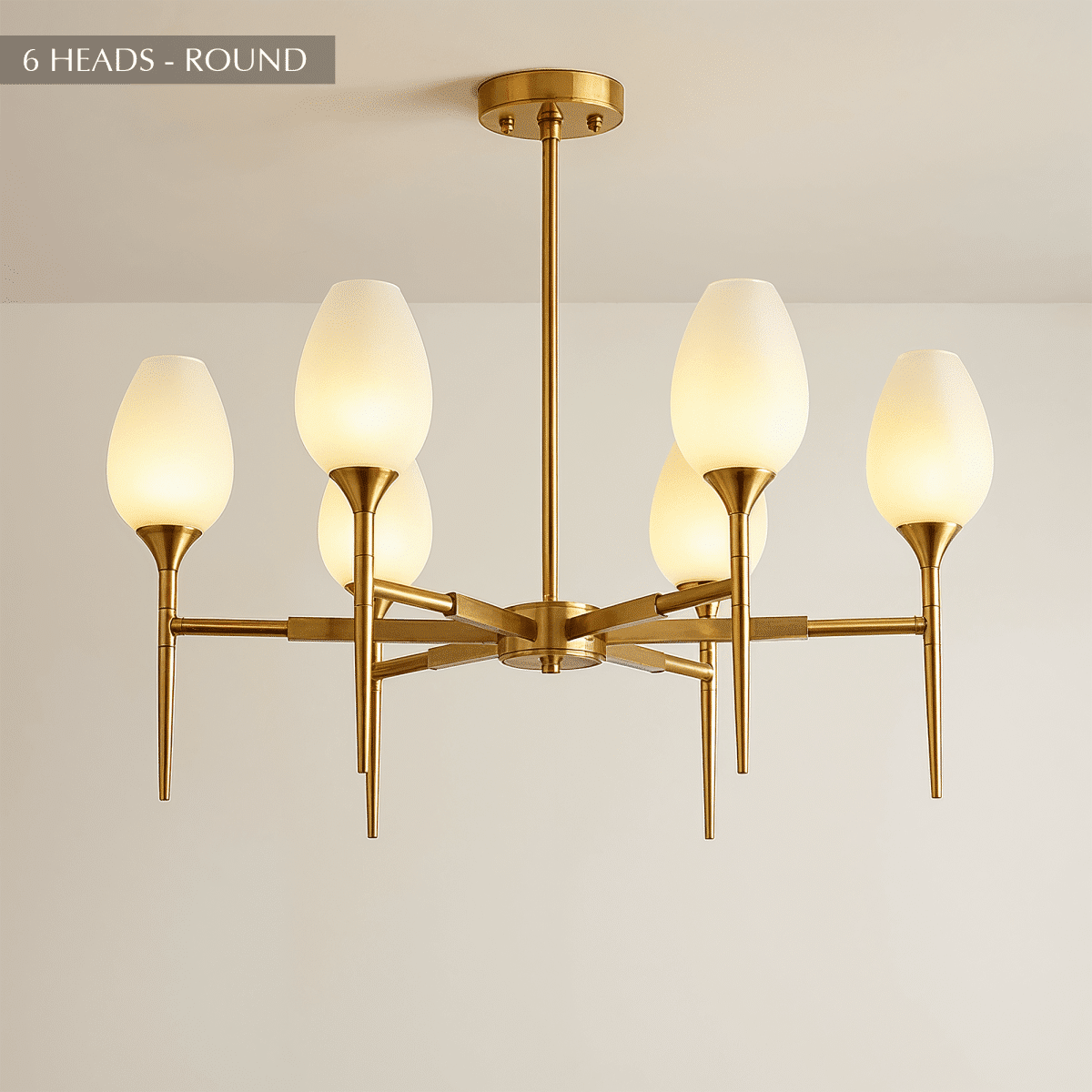 The Zylin Chandelier is a striking light fixture crafted from premium copper and complemented by elegant glass lampshades. Its design features sleek, tulip-inspired shades and a refined golden finish that brings a touch of modern luxury to any space. It offers versatile styling options to suit bedrooms, dining rooms, or living areas. The sophisticated structure blends artful geometry with warm ambient lighting, creating a statement centerpiece. This light fixture seamlessly combines contemporary aesthetics with timeless elegance for upscale interiors.