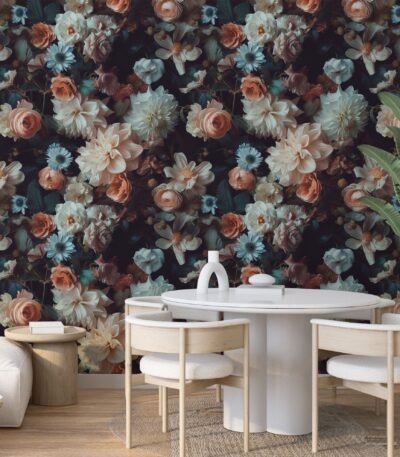 Moody Floral Wallpaper with Dark and Elegant Roses, Dahlias, and Anemones
